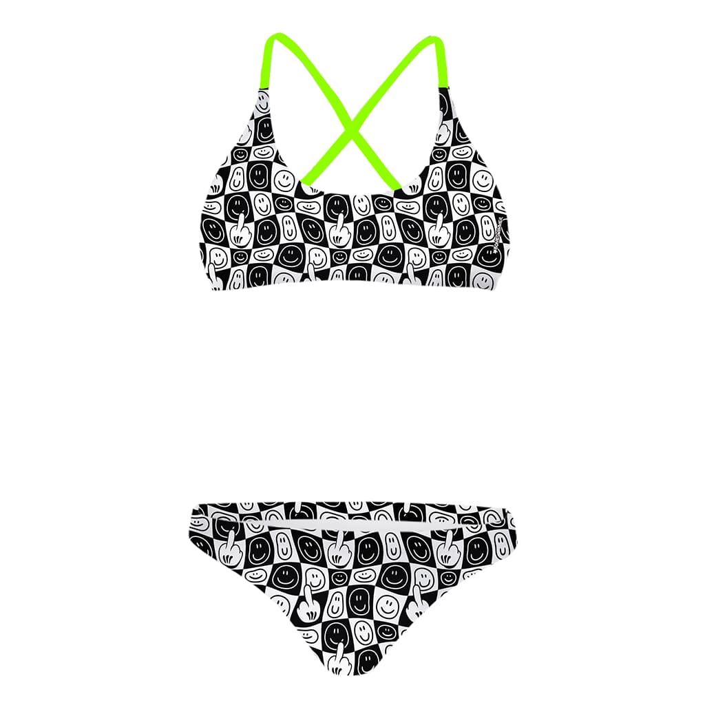 Bikini femme d'entraînement, modèle Maui. Un deux-pièces de piscine à coupe sportive, doublé à l'avant et conçu pour des entraînements intensifs et une utilisation régulière dans l'eau. Couleur de la bretelle : vert fluo.