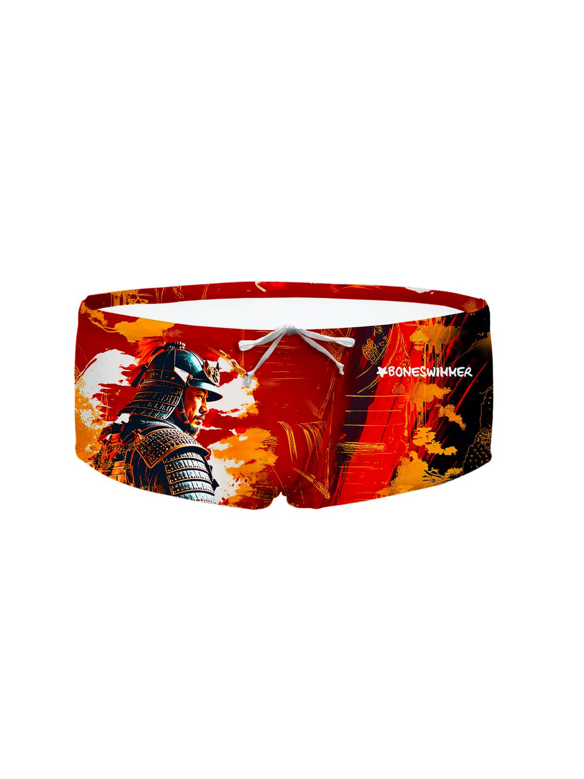 Le graphisme est audacieux et d'un fort impact visuel. Au dos domine le dessin hyperréaliste d'un serpent noir aux yeux bleu glace, détaillé dans les écailles et rendu encore plus agressif par le contraste avec l'orange vif qui traverse l'impression. Le style est puissant, inspiré d'un imaginaire urbain et sauvage, pensé pour ceux qui veulent exprimer courage et détermination même dans le bassin.