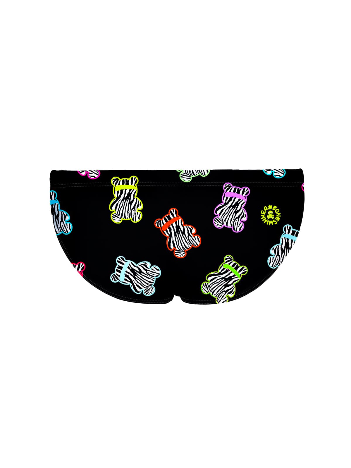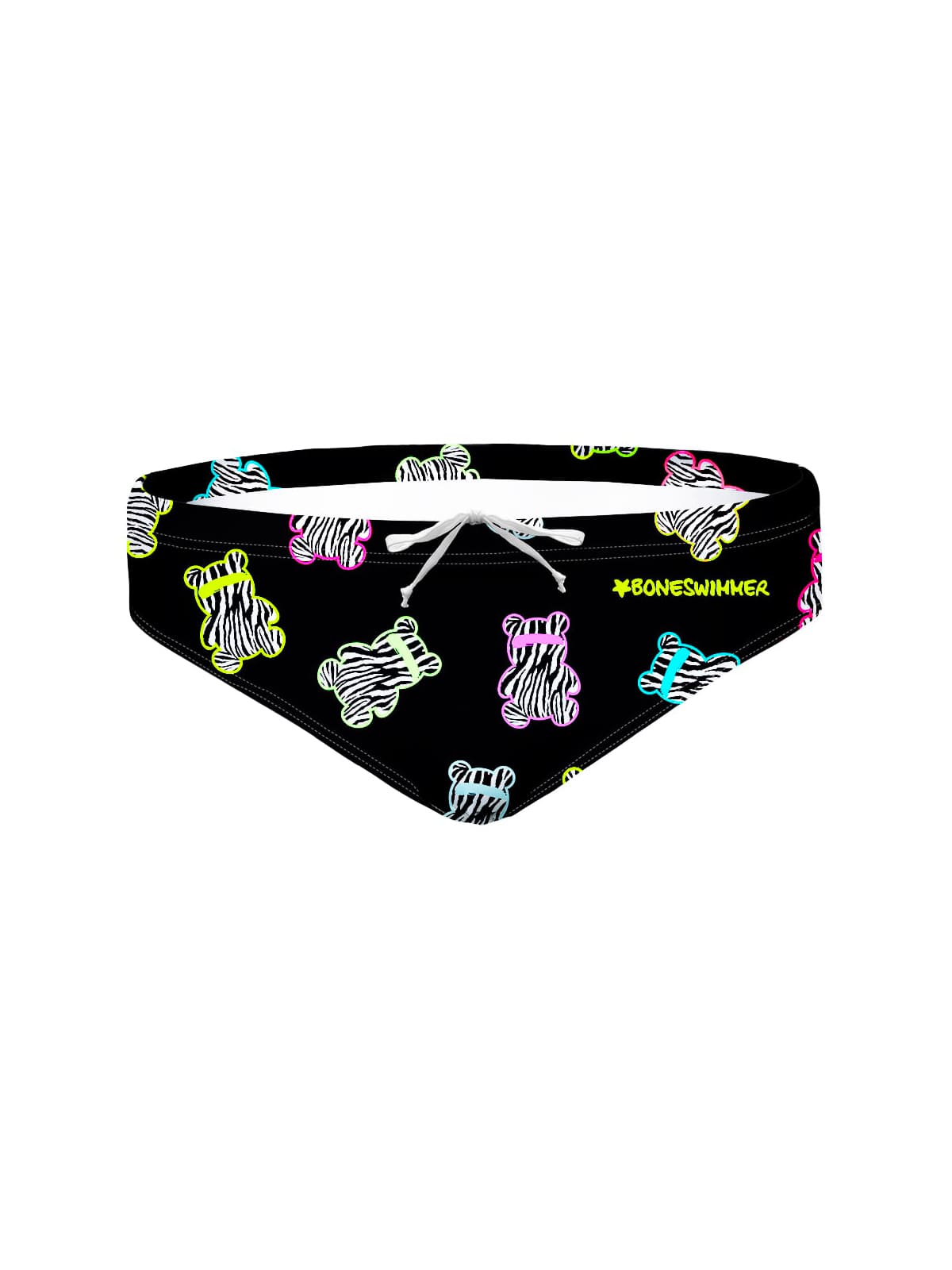 Slip de bain d'entraînement, modèle H2Otto. Impression "Abibò" : oursons en gomme zébrés et multicolores avec contours fluo sur fond noir – un look ironique et vif.
