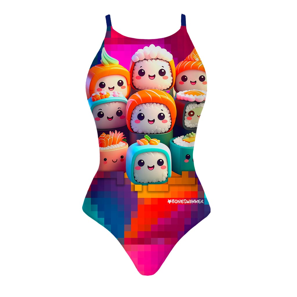 Stile: pensato per chi cerca un mix perfetto tra performance e originalità. La stampa a tema Sushi kawaii con colori brillanti e dettagli pixelati porta in acqua lo stile giapponese con un tocco divertente e pop, ideale per chi vuole distinguersi anche in vasca.