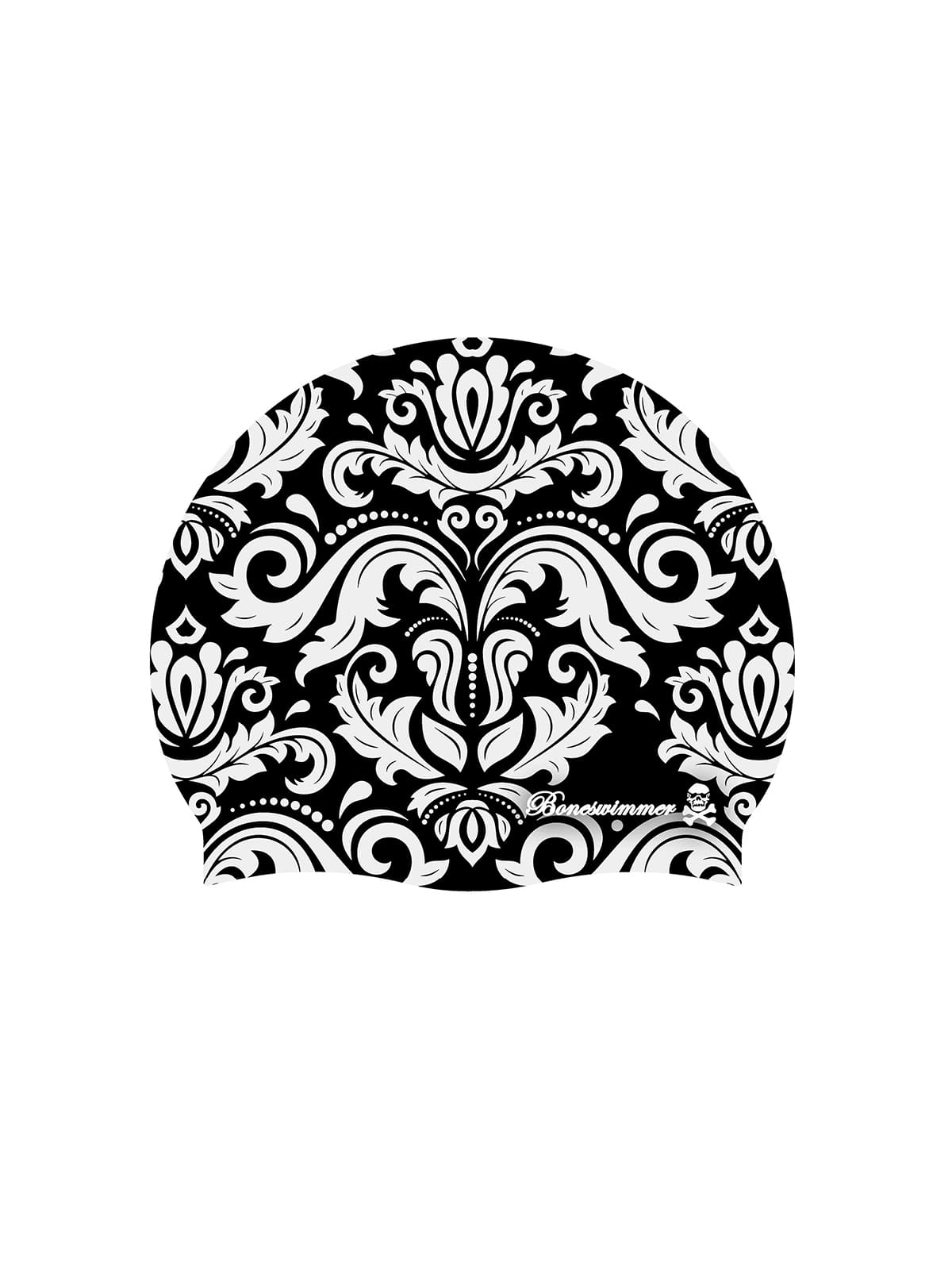 Cuffia da nuoto in silicone spessorato, sfondo nero con motivo damascato bianco ottico da abbinare ai nostri costumi unconventional.