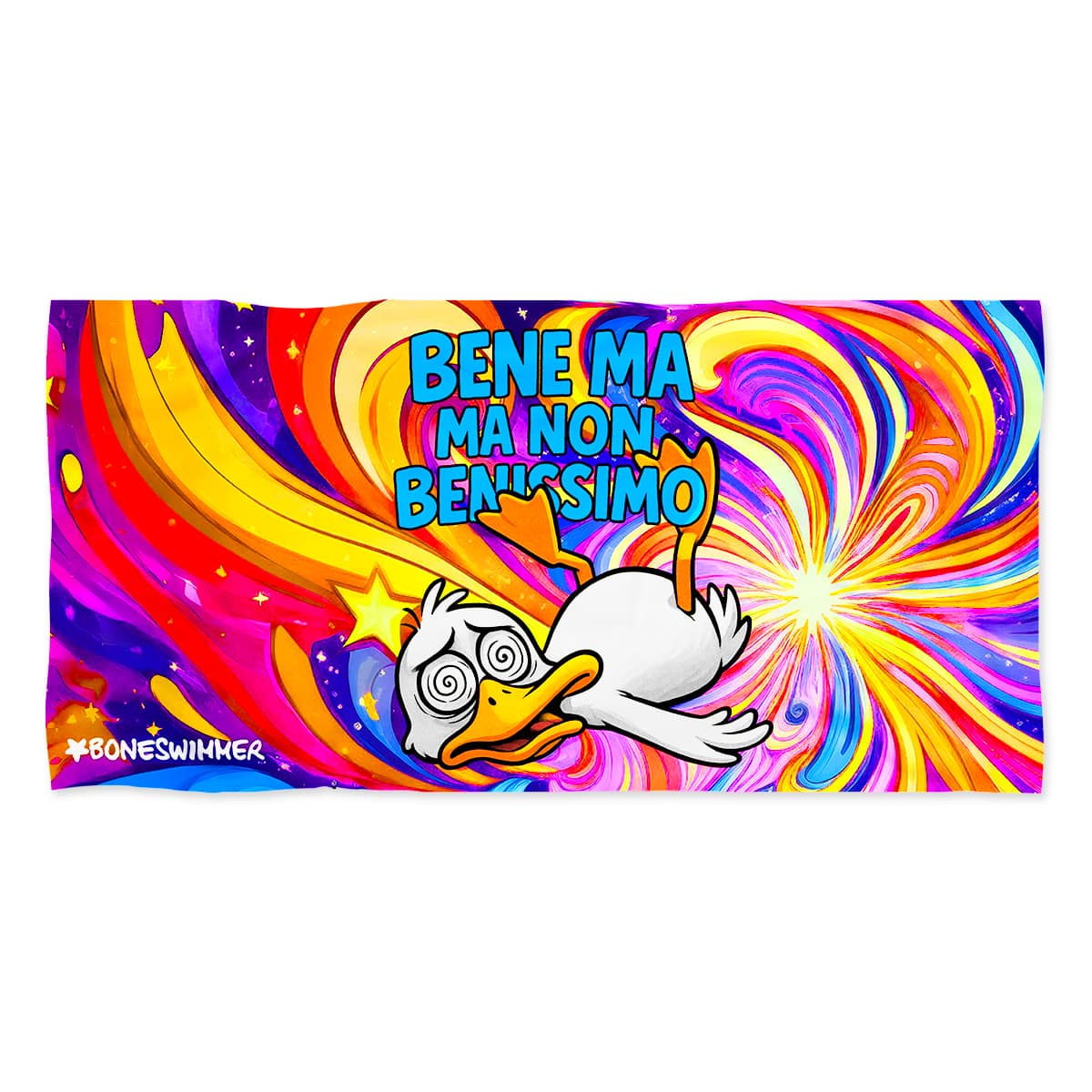 Stile: grafica pop e psichedelica con un paperotto stralunato in stile cartoon su un fondo di onde a colori: la palette neon (arancio, fucsia, viola, blu elettrico) e i dettagli fumettosi creano un look ironico e vistoso. Il mood è autoironia e buonumore: perfetto per chi porta energia in piscina per sdrammatizza l'agonismo e vuole un look che faccia sorridere chi lo vede.