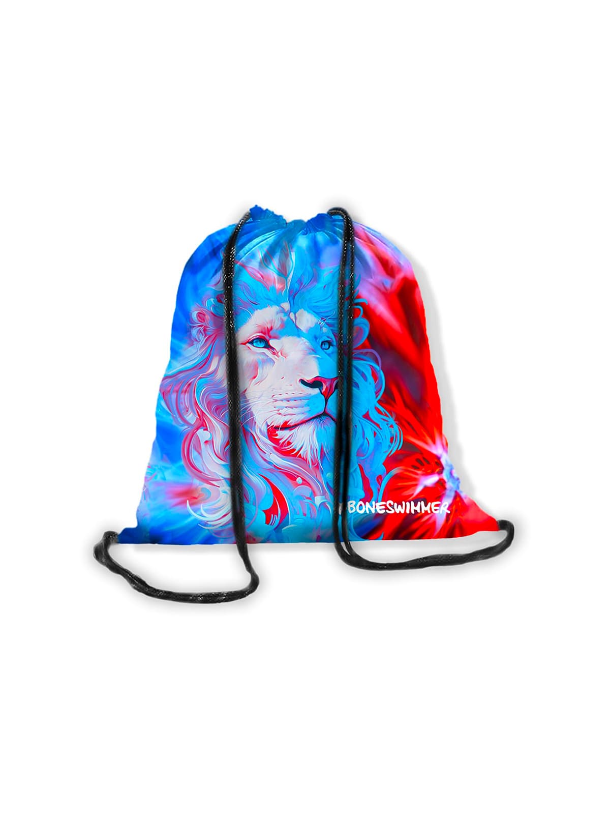 Zainetto a sacca in microfibra BONESWIMMER, stampa King. Un accessorio potente e maestoso che celebra la forza e il coraggio con la sua iconica grafica di un leone.