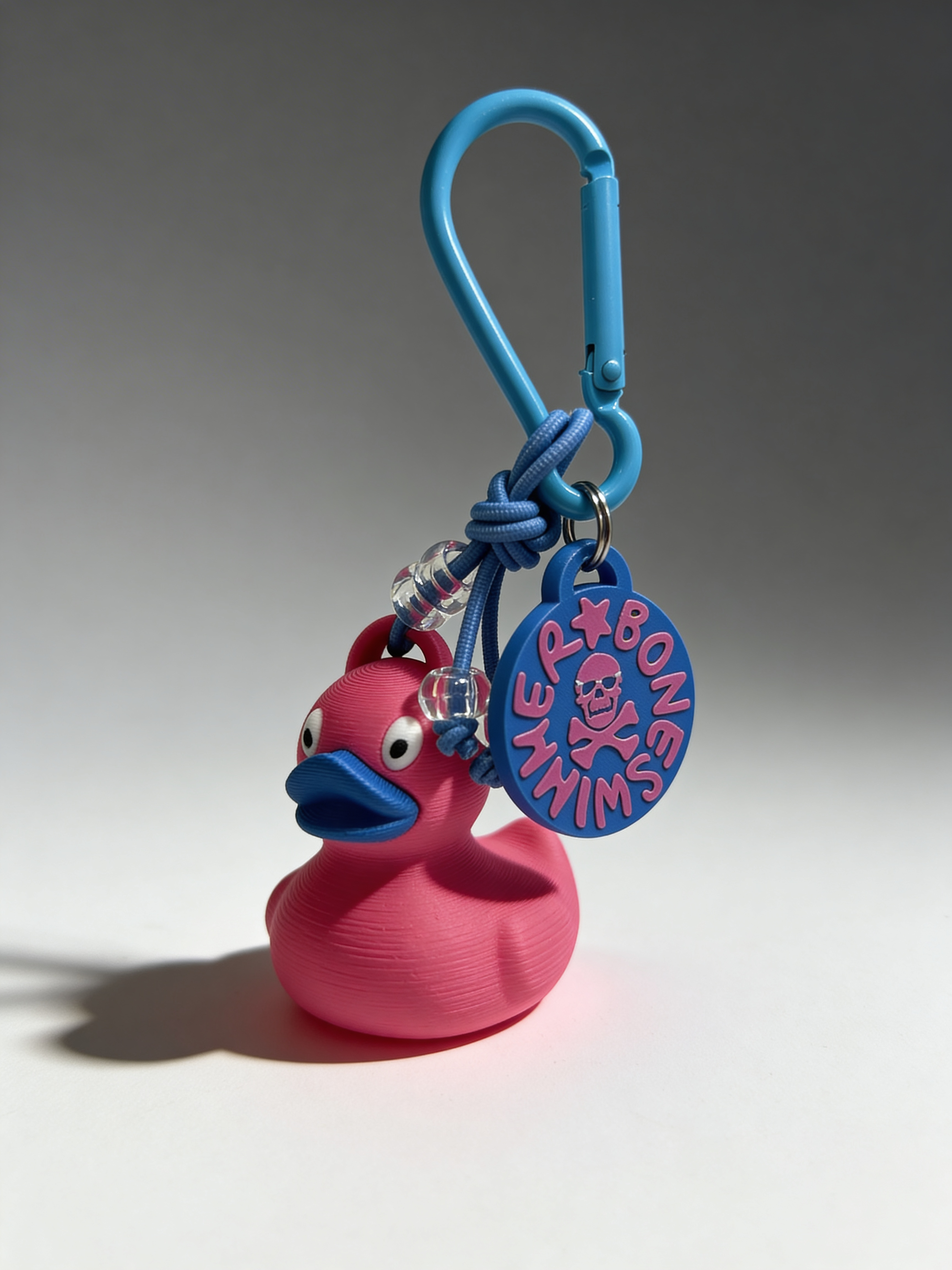 Ein dreidimensionaler Entchenanhänger mit BONESWIMMER-Abzeichen: ein Athletic Couture Detail, das Schlüssel, Tasche, Reisetasche oder Rucksack Charakter verleiht.