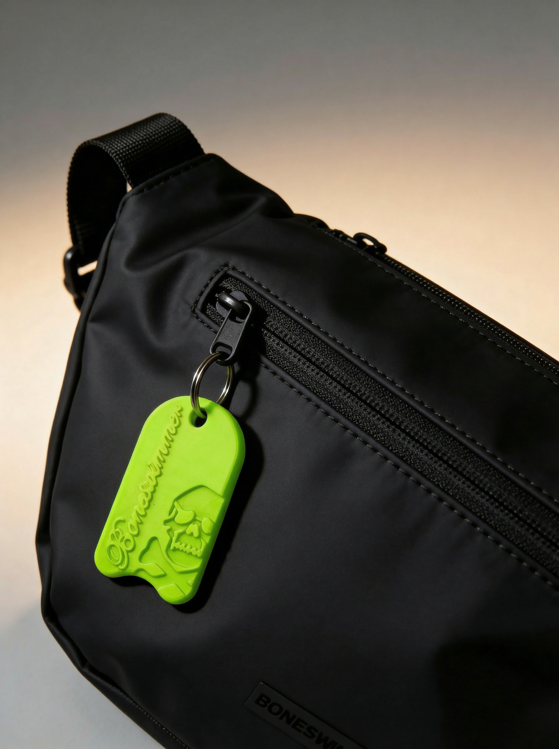 Das Trainingsbrett – auf das Wesentliche reduziert – wird zum Schlüsselanhänger. Ein Mikro-Objekt „athletische Schneiderei“: technisch, klar, unverkennbar. In dieser Variante: Grün.